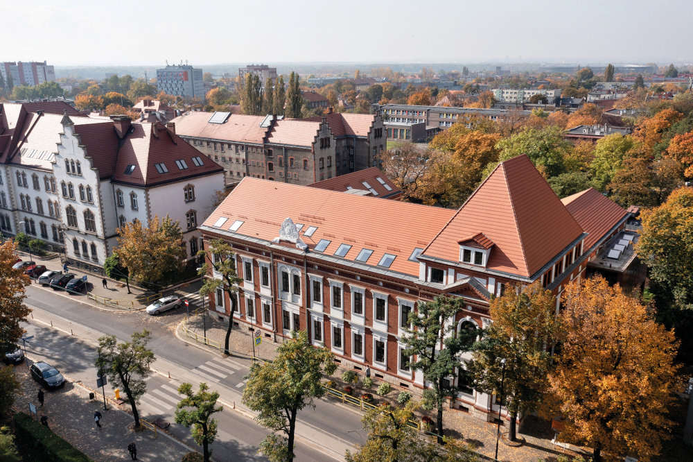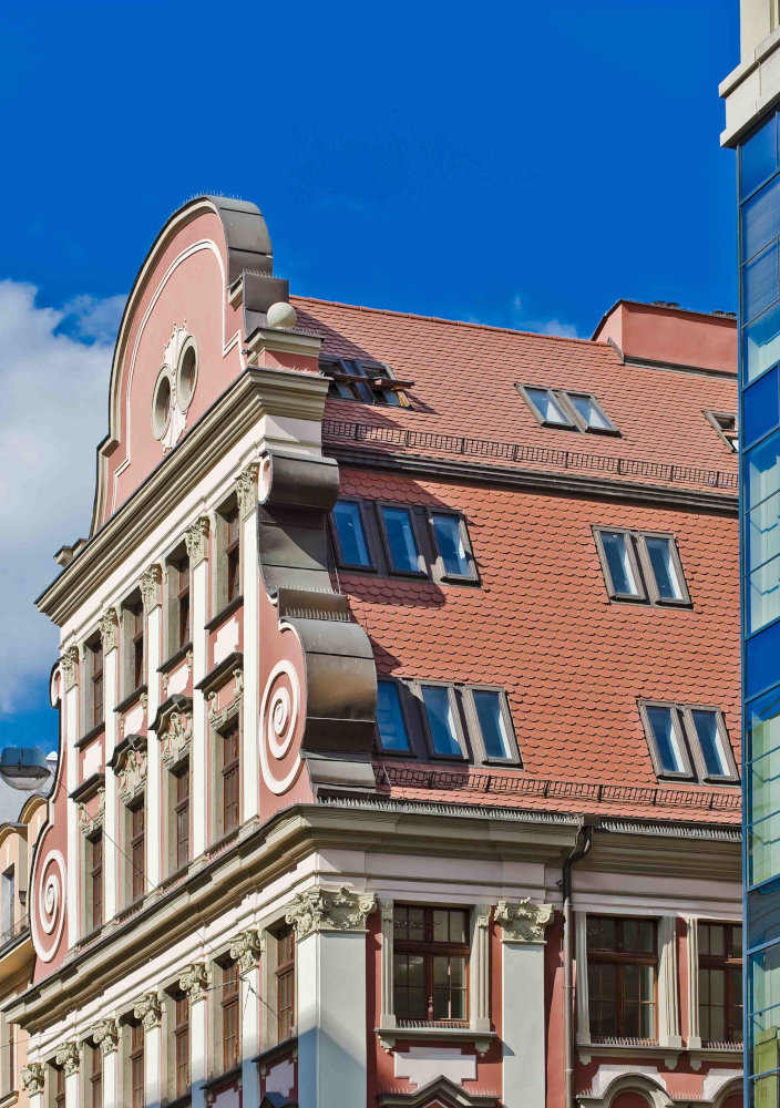 Tak przemyślane adaptacje poddaszy poprzez montaż okien dachowych stają się coraz bardziej popularne. Przykładem jest jedna z charakterystycznych nieruchomości we Wrocławiu, gdzie wizytówkę budynku stanowi ozdobiona licznymi rzeźbami fasada budynku. Jakiekolwiek zmiany w jej elementach byłyby natychmiast zauważone.  Tymczasem zamontowane okna dachowe FAKRO są dyskretnie wkomponowane w dach i pozostają niewidoczne z perspektywy przechodniów. W rezultacie budynek zachował swoją historyczną elewację, a jednocześnie zyskał nową funkcjonalność - możliwość zagospodarowania przestrzeni dotąd ukrytej pod dachem.