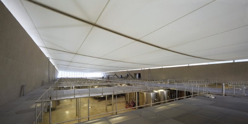Wkomponowany w pofałdowaną rzeźbę terenu budynek rozciąga się raczej w poprzek niż wznosi się ponad otoczenie, wtapiając się w skalę doliny. Wewnątrz produkcja, magazynowanie i degustacja rozwijają się w ciągłej sekwencji przestrzennej. Betonowe ściany oporowe i pogrubione płaszczyzny konstrukcyjne stabilizują ziemię, a łagodne światło i temperatura sprzyjają fermentacji i przechowywaniu. Przestrzenie publiczne rozwijają się stopniowo, przechodząc od zacienionych wnętrz do podwyższonych tarasów z widokiem na uprawne pola. Radić dyskretnie ingeruje poprzez dostosowanie konstrukcji i orientacji, aby ustabilizować ogrom przestrzeni.