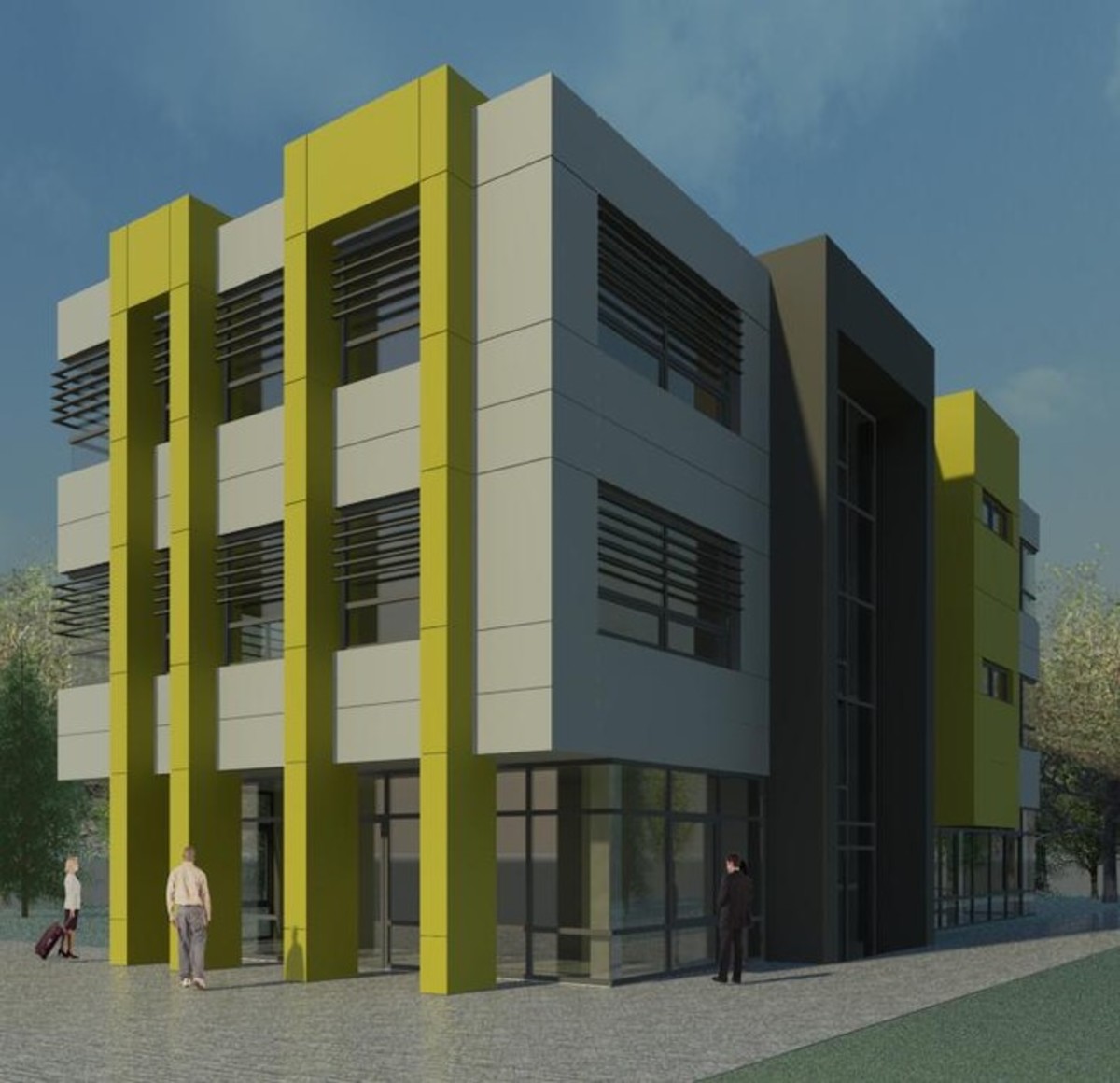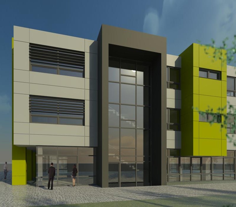 Budynek biurowy firmy West-Pol. Trzy kondygnacje nadziemne, podpiwniczony. Klatka schodowa z zapleczem sanitarnym rozdzielająca bryłę budynku na dwie części.