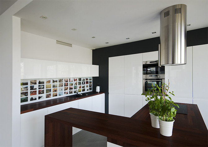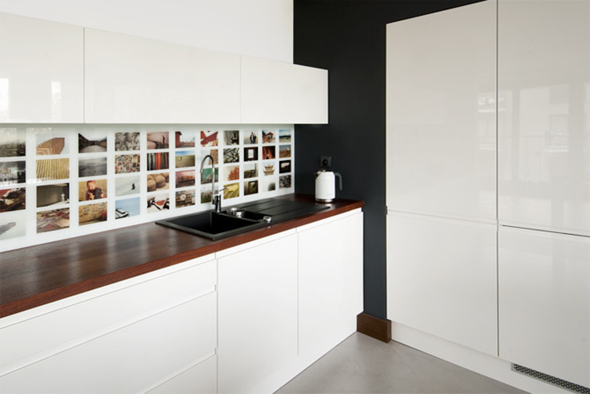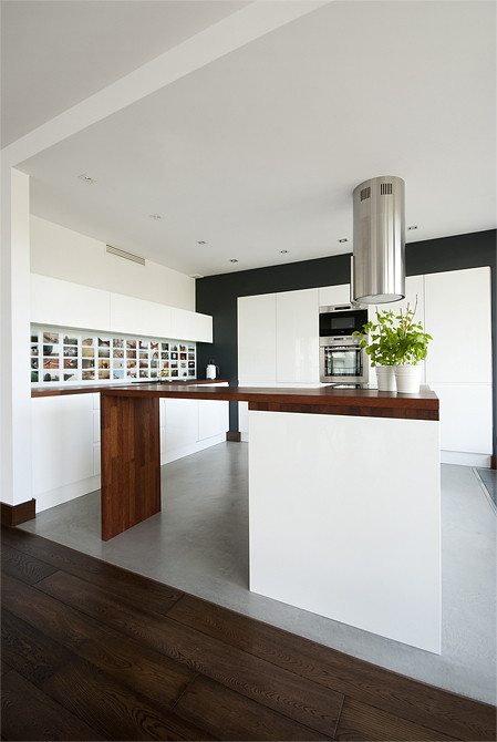 Duże, przestronne pomieszczenie pozwoliło na zaprojektowanie otwartej kuchni z obszerną wyspą. Surowe, lakierowane na biało fronty, betonowa posadzka oraz ciemnoszara ściana zostały przełamane drewnem o ciepłym kolorze. W przestrzeni pomiędzy wiszącymi szafkami a blatem umieszczono zestaw fotografii. Prywatne zdjęcia z podróży domowników nadają indywidualny charakter projektowanego wnętrza.