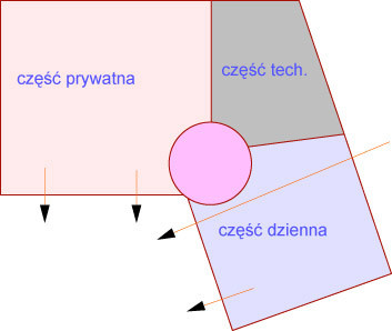 Dom składa się z części dziennej i w drugim skrzydle prywatno–gościnnej.