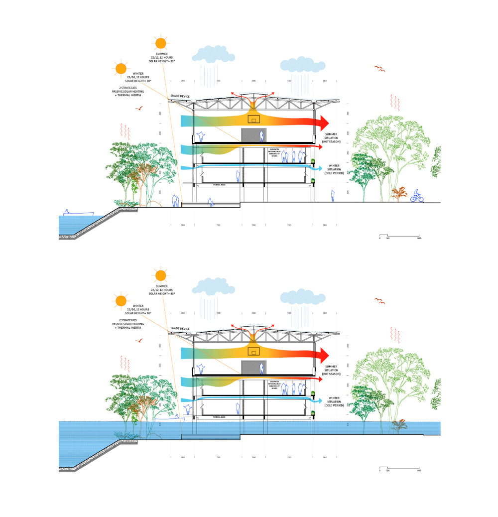 Szkoły dla obszarów zagrożonych powodzią: przekrój przedstawia przestrzenie przeprojektowane tak, aby funkcjonowały w normalnych warunkach i podczas powodzi.