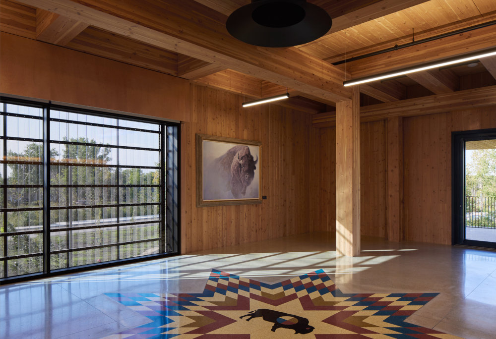 Centrum dla zwiedzających Buffalo Crossing: wnętrza odsłaniają drewnianą konstrukcję, dzieła sztuki i obfite światło dzienne, tworząc spokojną atmosferę.