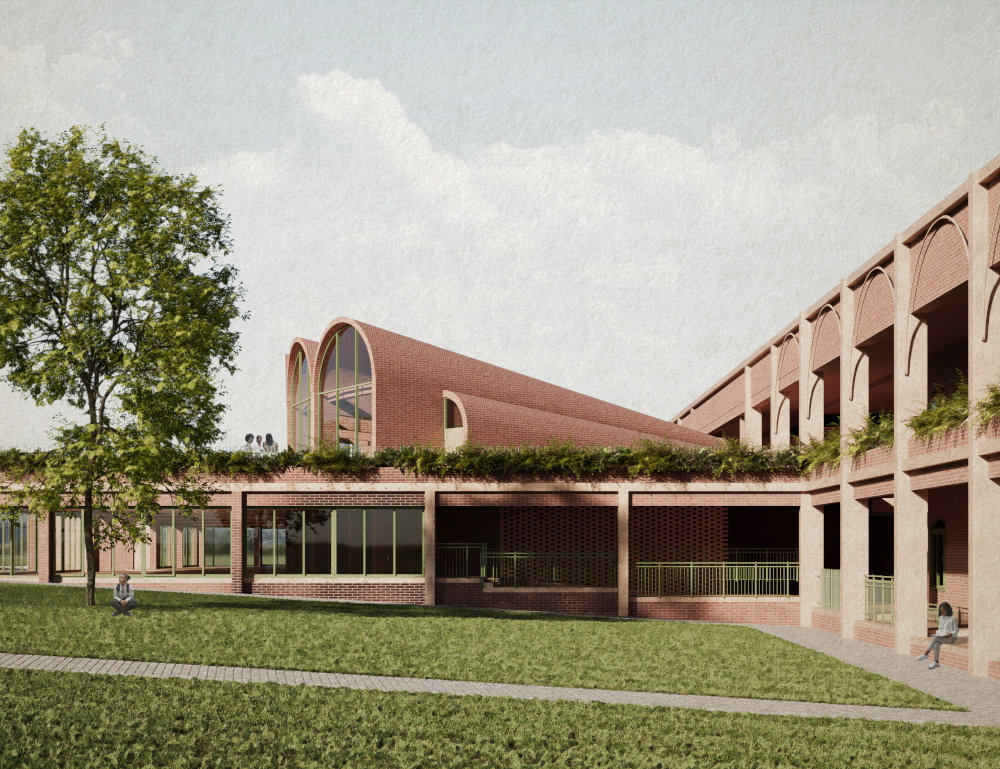 Elewacja wykonana z lokalnych cegieł ozdobionych tradycyjnymi wzorami podkreśla tożsamość regionu, a centralny dziedziniec z mostem powietrznym ożywia przestrzeń i poprawia komunikację.
