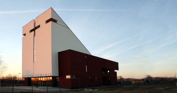 Podążając w stronę Kościoła, białą ścianę frontową widzimy już z daleka. Trójkątna dominanta góruje nad niewielkim osiedlem, odnajdując się w zastanej przestrzeni przemyślanym doborem materiału i kolorystki.
