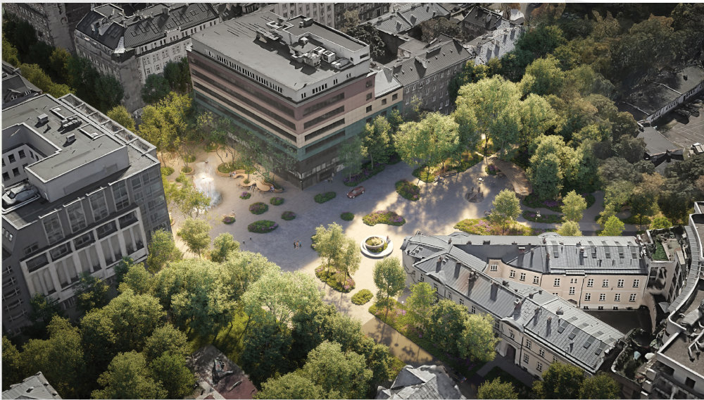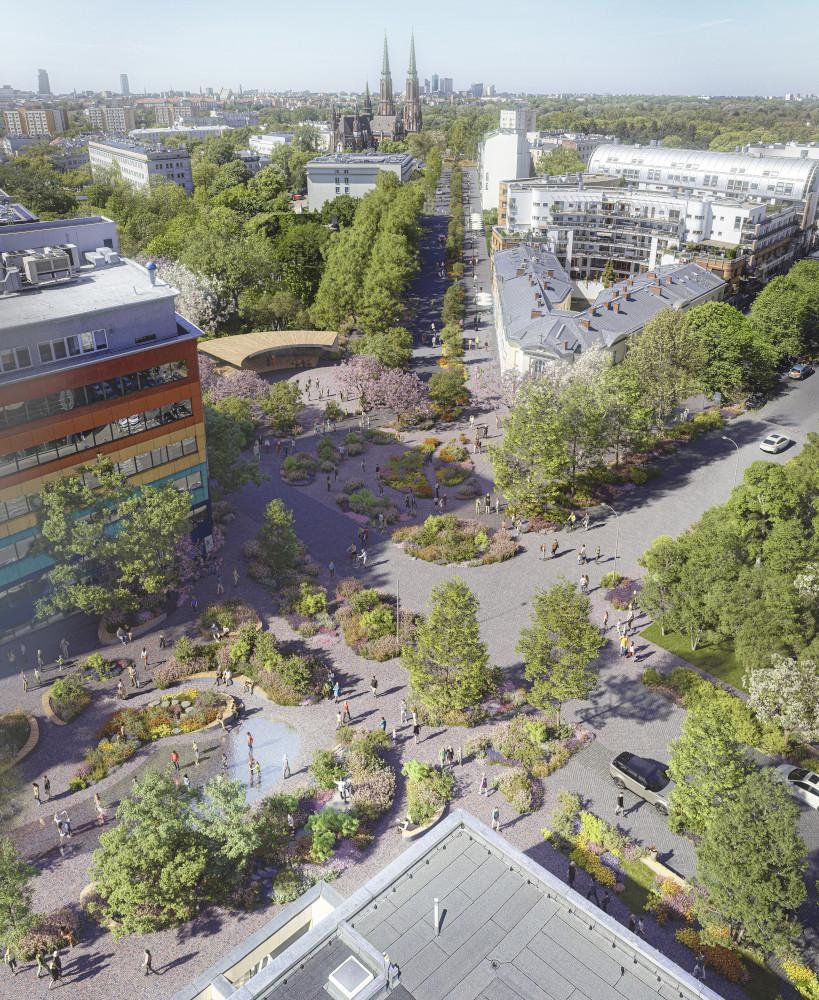 Autorzy pracy wykazali się dużą wrażliwością na kontekst miejsca. Umiejętnie wyeksponowali osie kompozycyjne i elewacje historycznych budynków. W koncepcji uwzględniono zarówno bogatą historię dzielnicy, jak i jej współczesne potrzeby rozwojowe, co przyczyni się do wzmocnienia tożsamości lokalnej społeczności. Zaproponowane rozwiązania projektowe z powodzeniem zrównoważą potrzeby różnych grup użytkowników. Przestrzenie z zielenią, jak i enklawy wypoczynku są przemyślane, zróżnicowane i inkluzywne. W projekcie przewidziano rozwiązania przyjazne osobom starszym i z niepełnosprawnościami, a także dzieciom. Zaproponowana przestrzeń jest elastyczna i przygotowana na potrzeby różnorodnych scenariuszy programowych, od wydarzeń sąsiedzkich po większe imprezy miejskie. (…)