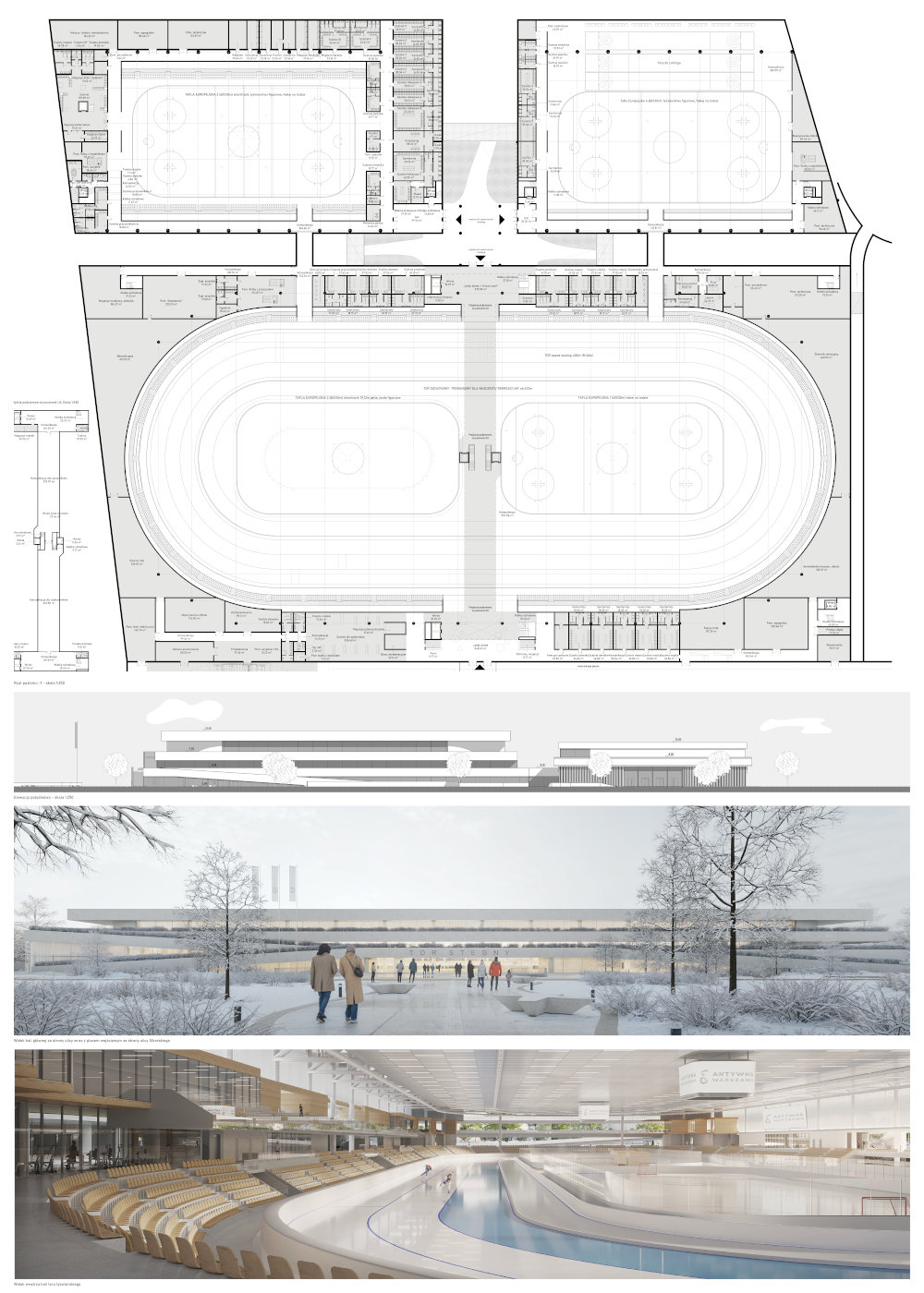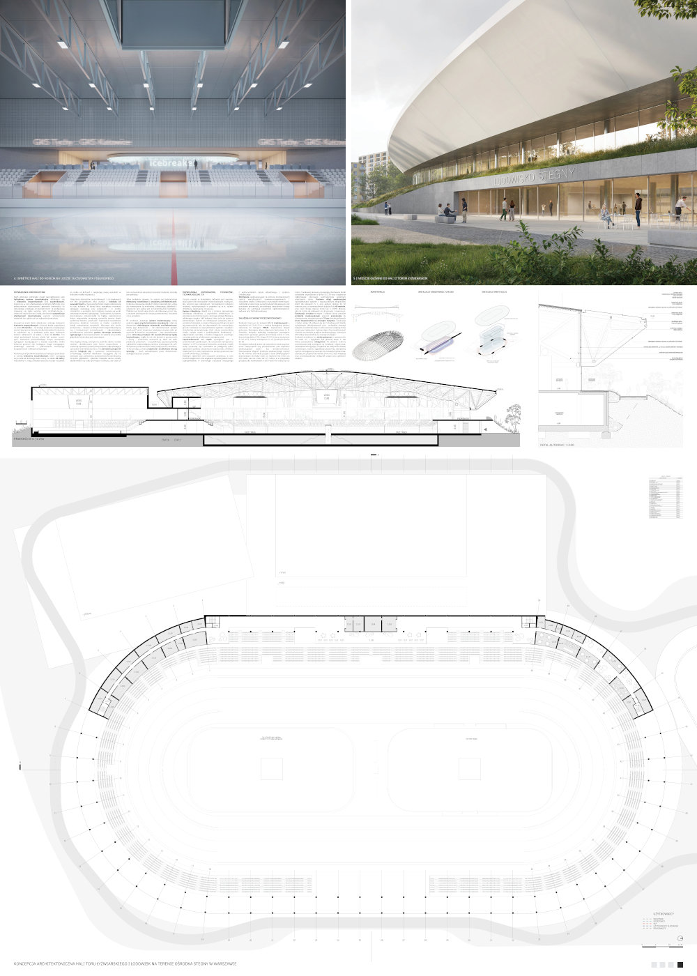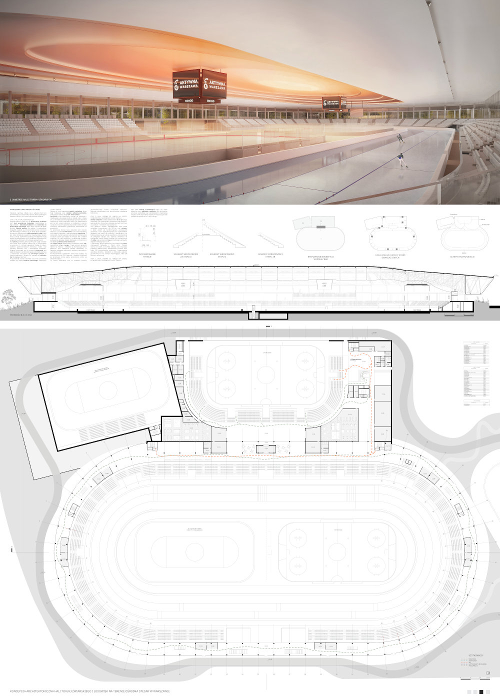 1 nagroda w konkursie na koncepcję architektoniczna hali toru łyżwiarskiego oraz dwóch hal lodowych dla Ośrodka Stegny | Autorzy: P2PA Sp. z o. o. i Metropolis Sp. z o. o.