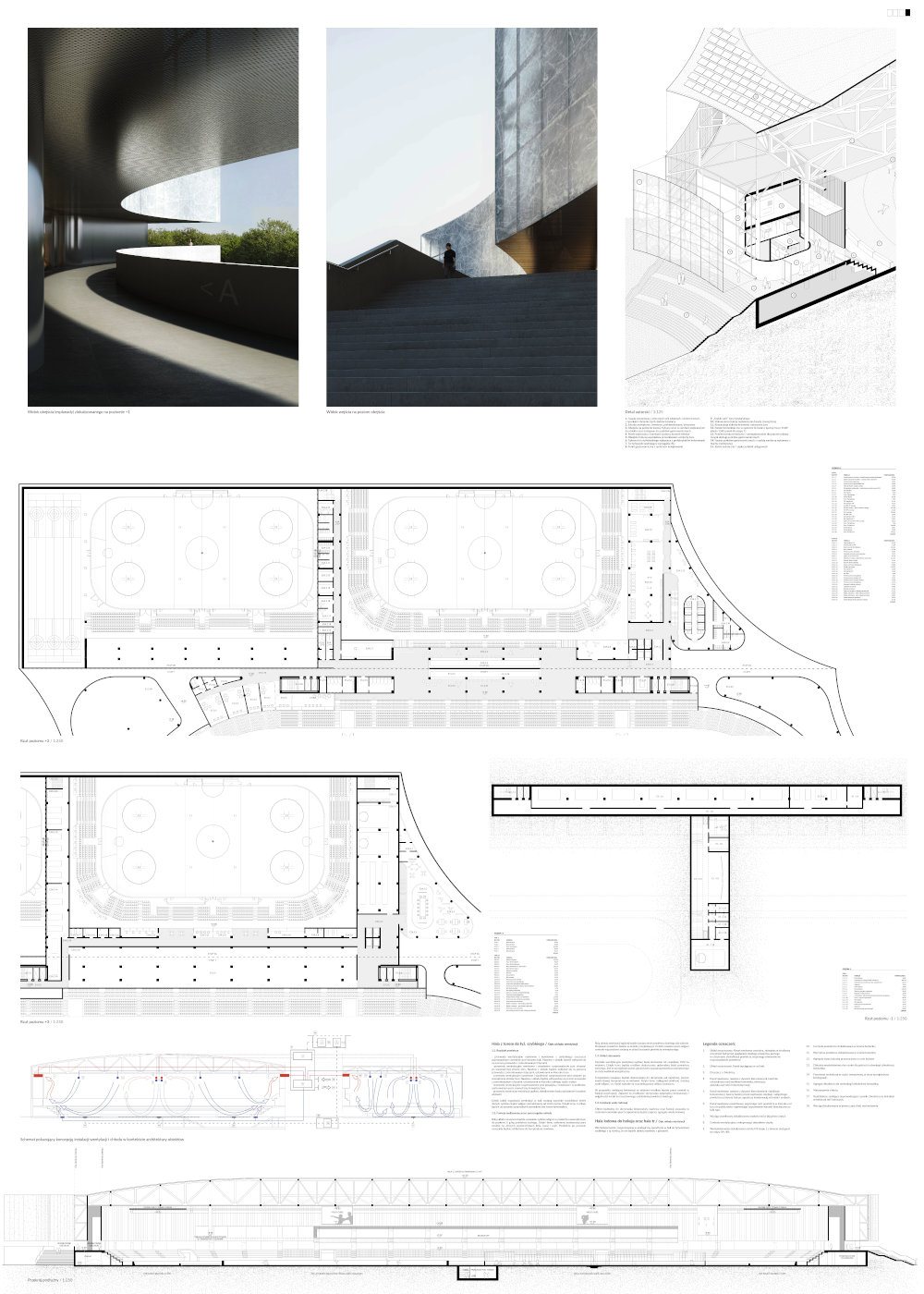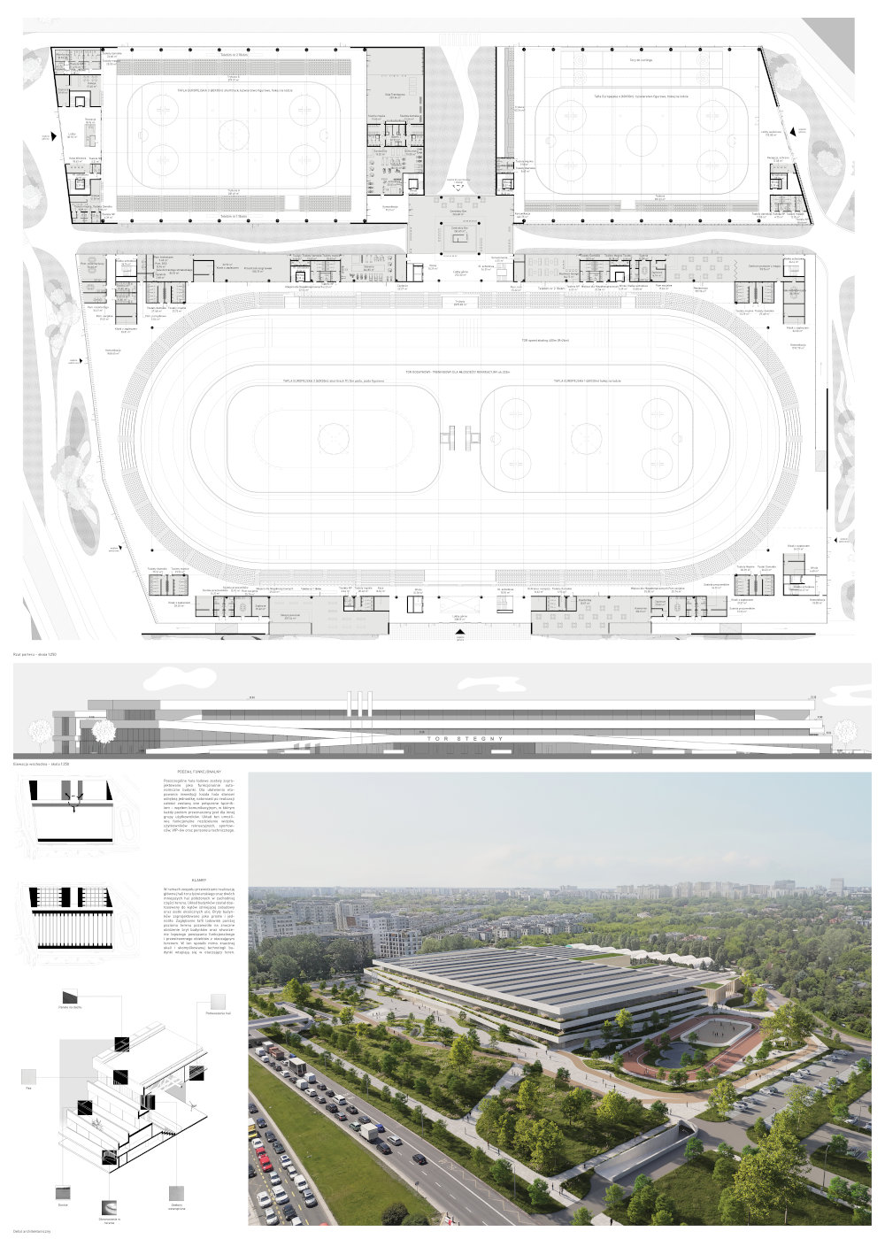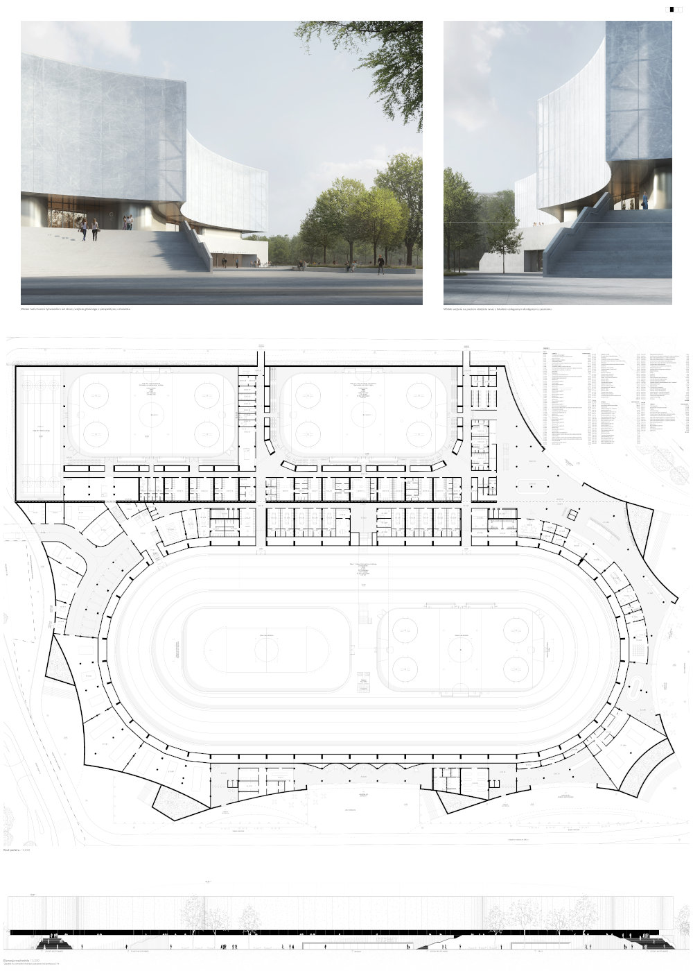 1 nagroda w konkursie na koncepcję architektoniczna hali toru łyżwiarskiego oraz dwóch hal lodowych dla Ośrodka Stegny | Autorzy: P2PA Sp. z o. o. i Metropolis Sp. z o. o.