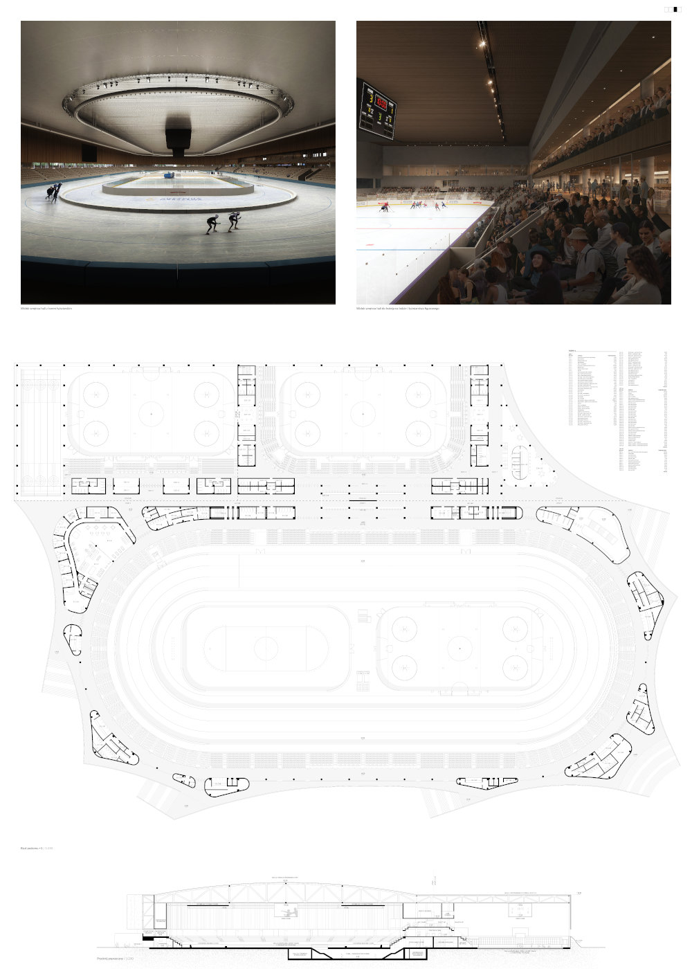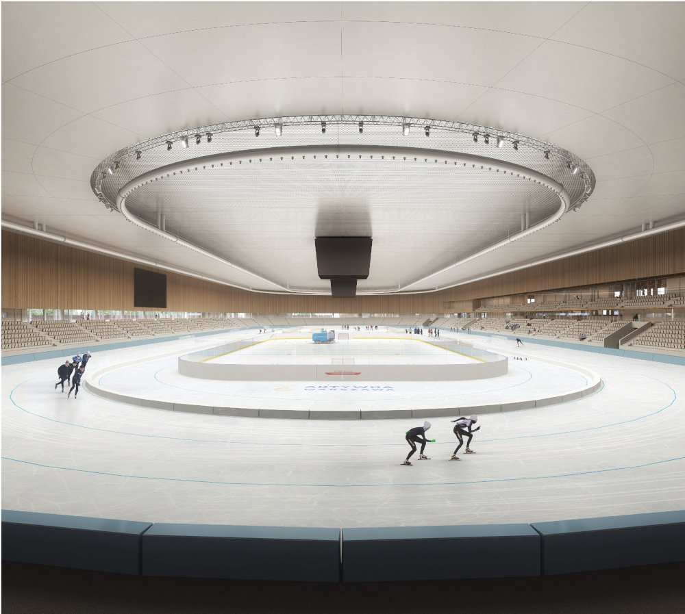 Walorem pracy jest zlokalizowanie na wspólnej osi widokowej głównej hali do łyżwiarstwa szybkiego z halą drugiego etapu dla łyżwiarstwa figurowego i hokeja na lodzie, co daje wgląd do wnętrza obu hal z centralnego baru.
