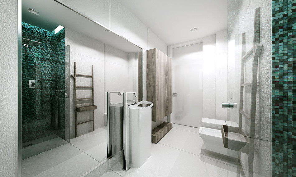 Minimalizm od samego wejścia. Biel i jasne mało narzucające się drewno.
