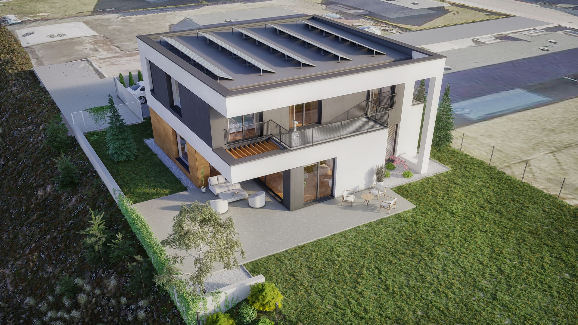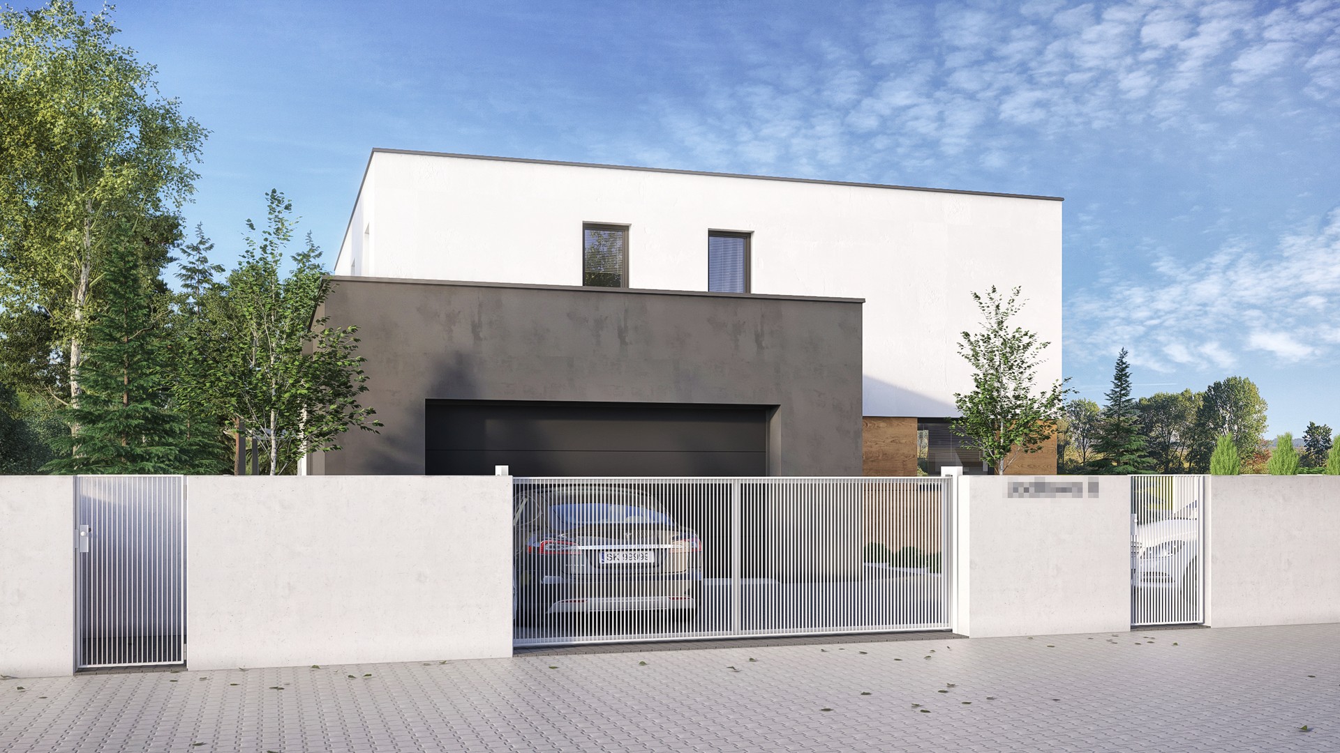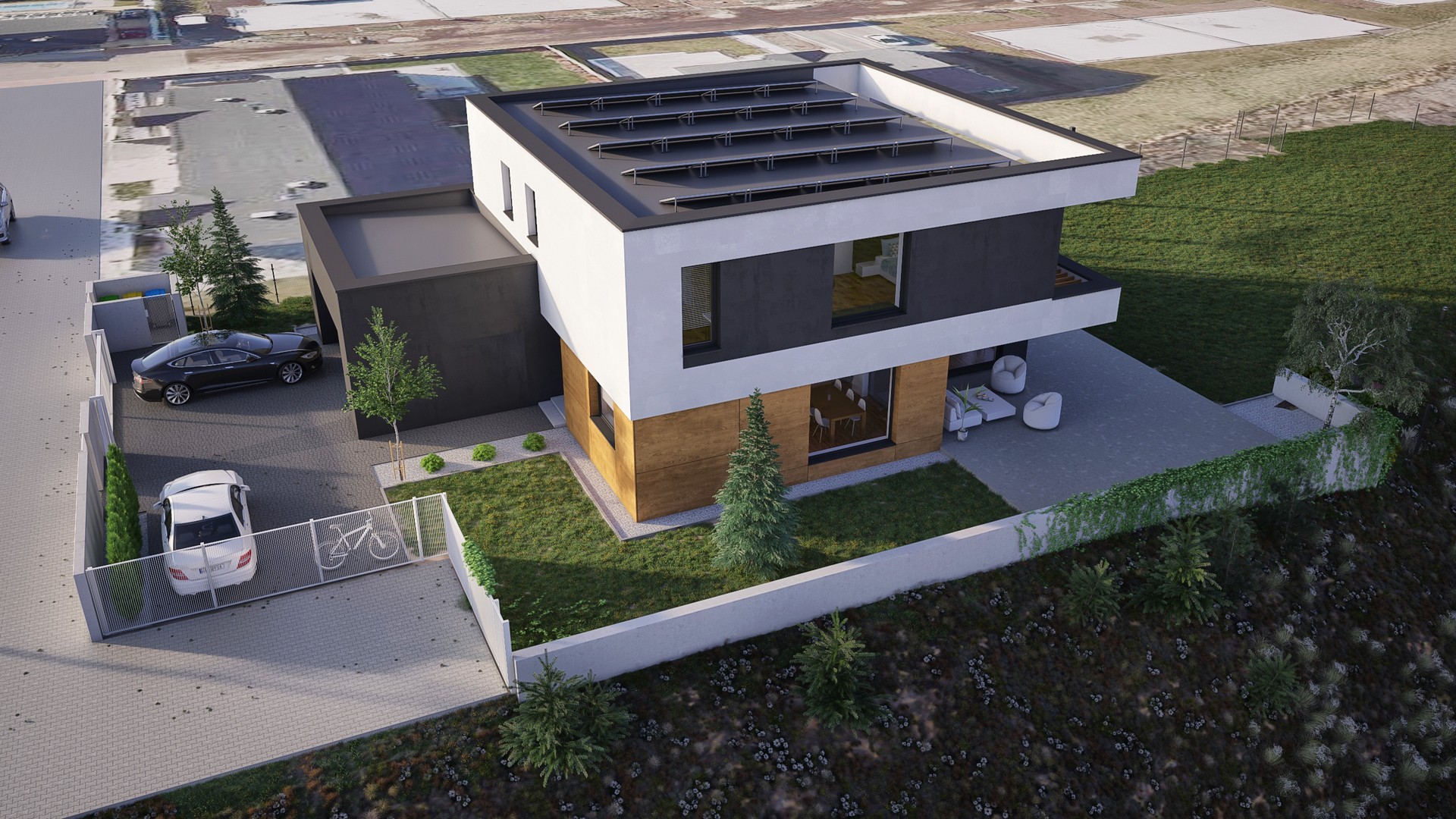 Projekt obejmuje dwukondygnacyjny dom jednorodzinny z płaskim dachem (zgodnie z MPZP – jednospadowym), zlokalizowany w Siemianowicach Śląskich. Budynek powstał na nietypowej działce o wyjątkowych walorach widokowych – położonej na nasypie, wzdłuż którego od północy biegnie skarpa o wysokości ok. 7 m. Z działki roztacza się malowniczy widok ponad lasem na pola i rzekę, co zadecydowało o wyborze lokalizacji mimo trudnych warunków zabudowy.