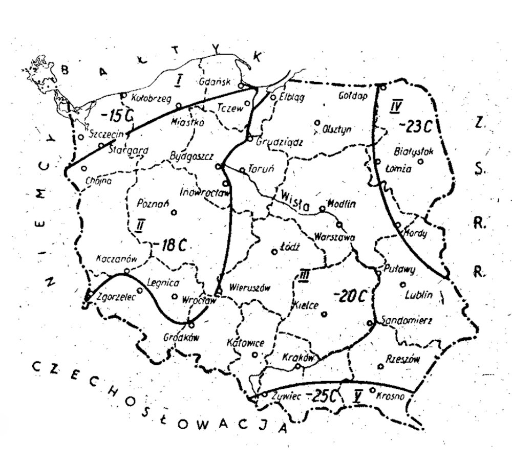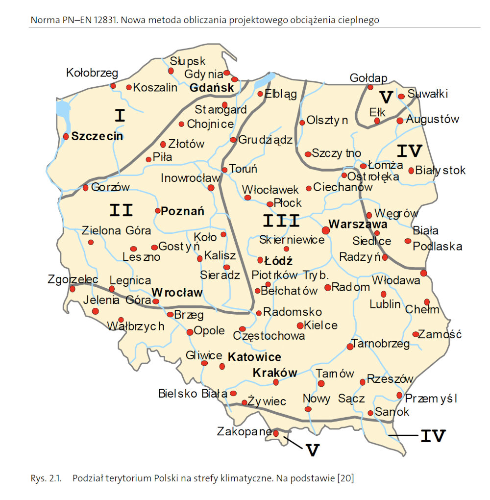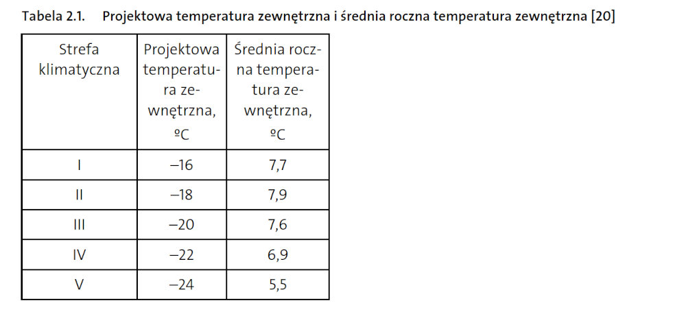 Zgodnie z powyższym Polska podzielona jest na 5 stref klimatycznych, które służą jako wzorzec do projektowania instalacji grzewczych. Każda strefa posiada swoją temperaturę obliczeniową lub projektową zewnętrzną, na której podstawie wyznacza się moc szczytową moc urządzenia grzewczego. Dla porównania poniżej dane z 1950 r. oraz najnowsze wg. PN-EN 12831 z 2006 roku.