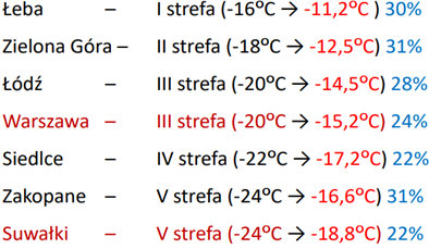 Przykładowo wg tabeli znajdującej się we wspomnianych badaniach, temperatura obliczeniowa w Suwałkach mogłaby spaść nawet o 25%. Przypomnijmy, że dane temperaturowe, na których podstawie przyjęto obecnie obowiązujące temperatury obliczeniowe, pochodzą z norm PN-74/B-02493 i jej aktualizacji PN-82/B-02403 z lat 1971-2000. Krótko mówiąc, klimatycznie dalej żyjemy w latach 70. ubiegłego wieku. Poniżej procentowe zmiany w innych miastach charakterystycznych dla danej strefy.