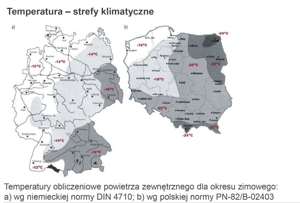 Jak wynika z badania New External Design Temperatures and Geospatial Models for Poland and Central Europe for Building Heat Load Calculations nowe temperatury projektowe, kluczowe dla doboru systemów grzewczych wahają się od -10°C w Świnoujściu do -19°C w Suwałkach. Porównując te dane z normą niemiecką DIN 4710 obowiązującą dla Niemiec, można odnieść wrażenie, że cały niemiecki klimat przesunął się w stronę Polski.