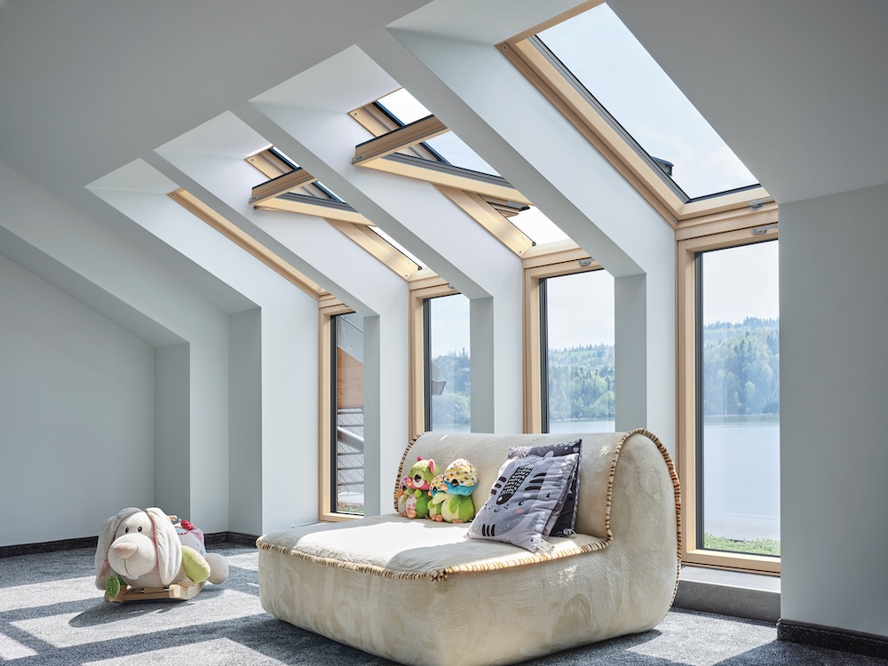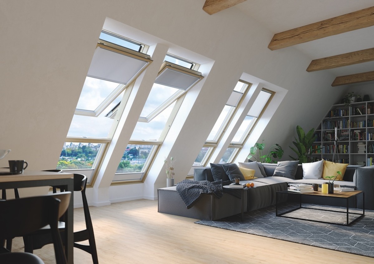 Dwuskrzydłowe okna dachowe, w których górne skrzydło otwierane jest obrotowo, a dolne jest stałe, pozwalają uzyskać efekt długiego przeszklenia sięgającego aż do podłogi, bez potrzeby zespalania okien w pionie. Delikatna wizualnie konstrukcja okna, przedzielona jedynie filigranową poprzeczką, nie zakłóca widoku na zewnątrz.