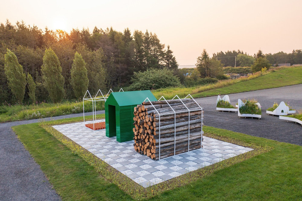 Na pierwszym planie: Patrick Bérubé, „Back / Ground”, 2025. Po prawej stronie: ONOMIAU, „Les huit collines”, 2022–2025. Zdjęcie: Jean-Christophe Lemay