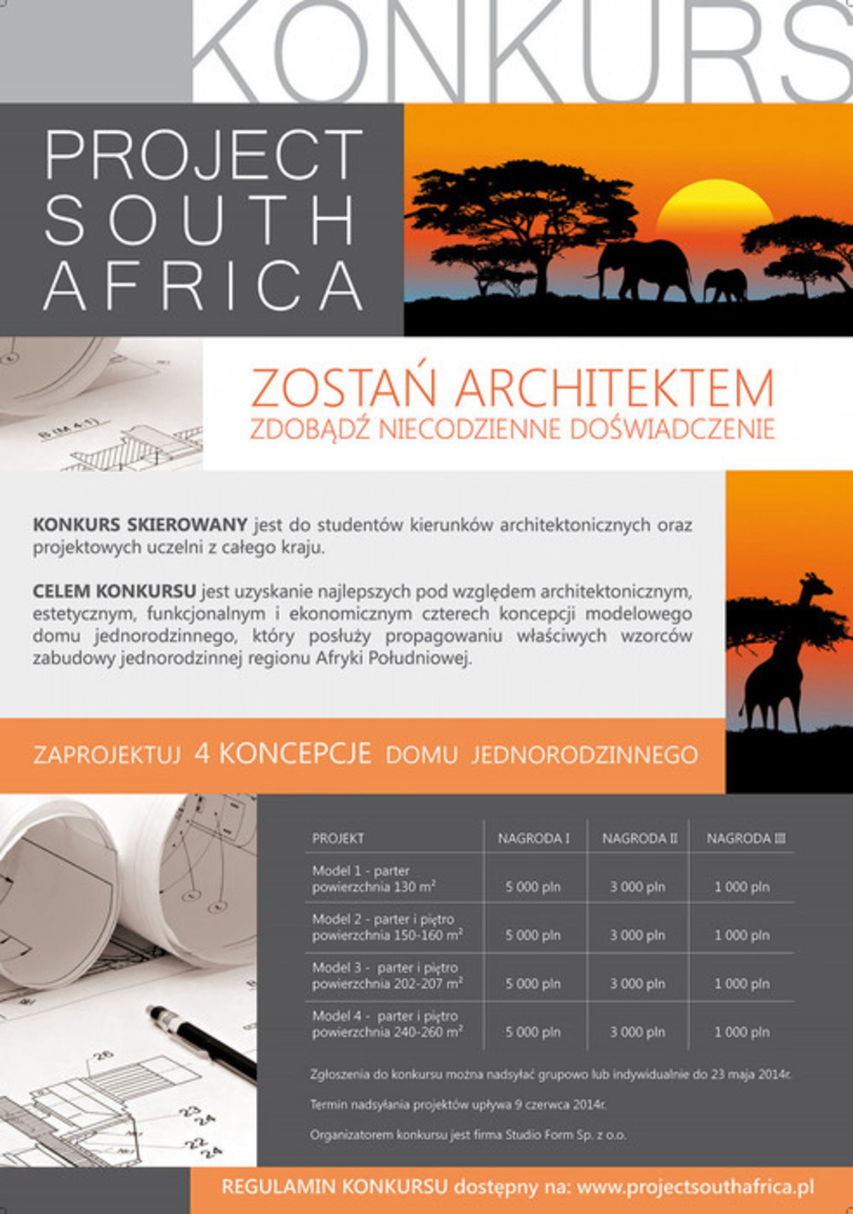 Konkurs architektoniczny Project South Africa skierowany jest do studentów z całej Polski. Zadaniem uczestników jest opracowanie koncepcji architektonicznej domu jednorodzinnego zlokalizowanego w Południowej Afryce.