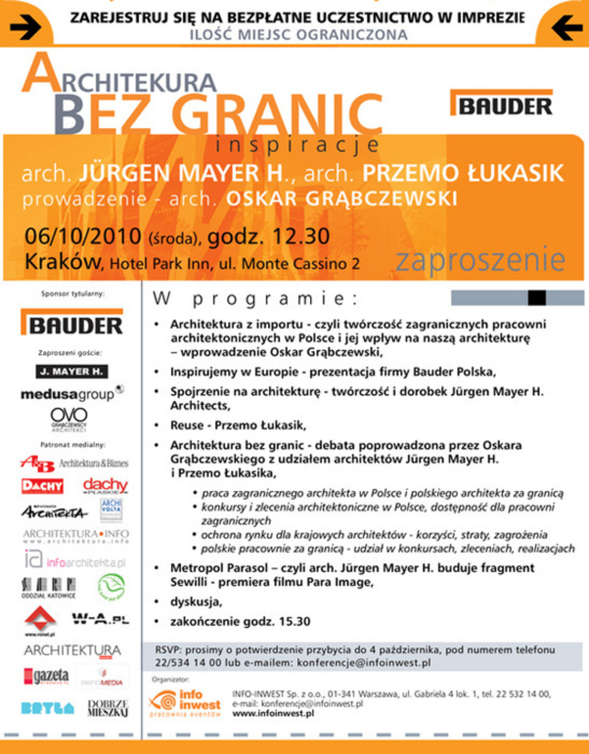 Podczas spotkania odbędzie się premierowa prezentacja filmu Para Image pod tytułem „Metropol Parasol - czyli arch. Jürgen Mayer H. buduje fragment Sewilli”.