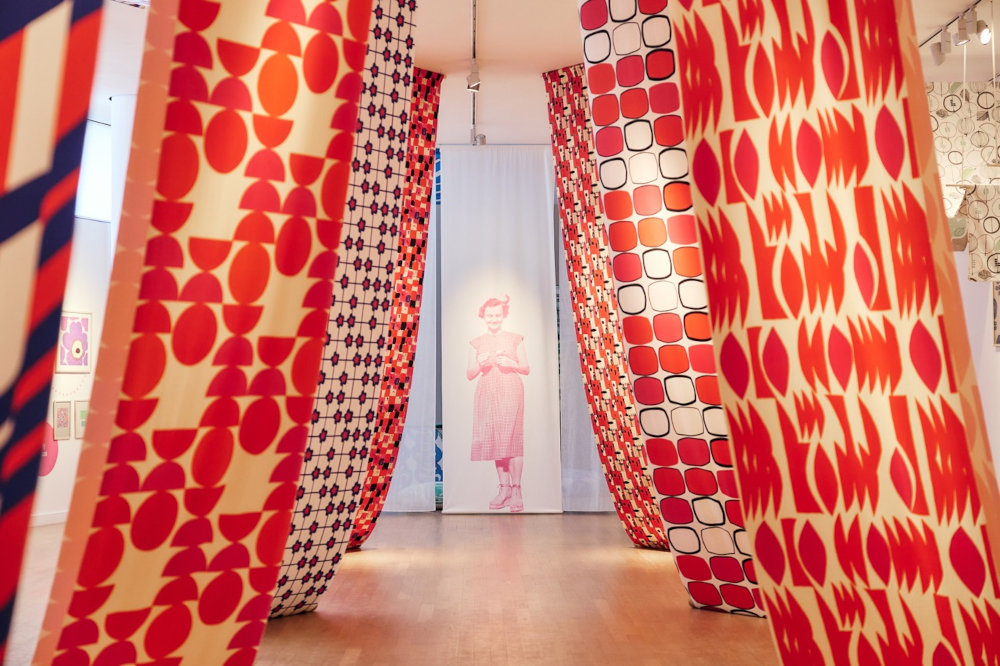 Pojawia się też tu dużo przeskalowanych fotografii, motywy kół, mocna typografia, a czasami działanie większą powierzchnią wzoru, jak w zasłonach czy tapetach. Autorki chciały bowiem, żeby wystawa nie ograniczała się tylko do ramek z reprodukcjami. Dlatego tak ważną częścią projektu stały się elementy przestrzenne, wielkoformatowe tkaniny, przeskalowane wzory i różnorodne formy prezentacji materiału.
