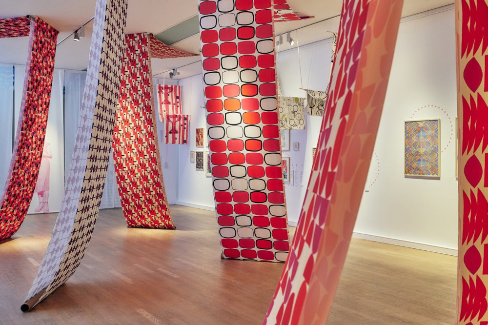 – Zależało mi, żeby oddać energię i ducha projektów Alicji Wyszogrodzkiej za pomocą kolorów, wzorów i typografii, a także skali i kompozycji. W projekcie identyfikacji, a potem też w elementach wystawienniczych, jak ścianka tytułowa, oś czasu czy tkanina pod sufitem, która prowadzi nas przez wystawę, postanowiłam oprzeć się na niewdrożonym projekcie tkaniny dekoracyjnej autorstwa Alicji Wyszogrodzkiej powstałym w latach 60. Projekt z motywem kolorowych kół i półkoli został poddany reinterpretacji i stał się leitmotivem całej oprawy graficznej wystawy. Także kolor w pracach pani Alicji odgrywa szczególną rolę, zestawienia kolorystyczne są bardzo odważne i energetyczne. Na samej wystawie skupiłam się na zestawieniu koloru czerwonego z różowym i bordowym. To jedno z ulubionych zestawień artystki. – wyjaśnia Anita Wasik.