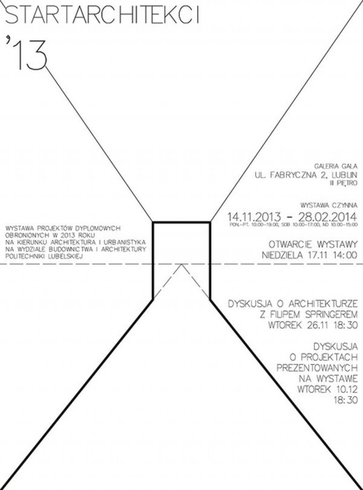Wydział Budownictwa i Architektury Politechniki Lubelskiej i Galeria Gala serdecznie zapraszają na wystawę STARTARCHITEKCI’13. Jest to wystawa projektów dyplomowych obronionych w 2013 roku na Wydziale Budownictwa i Architektury Politechniki Lubelskiej.