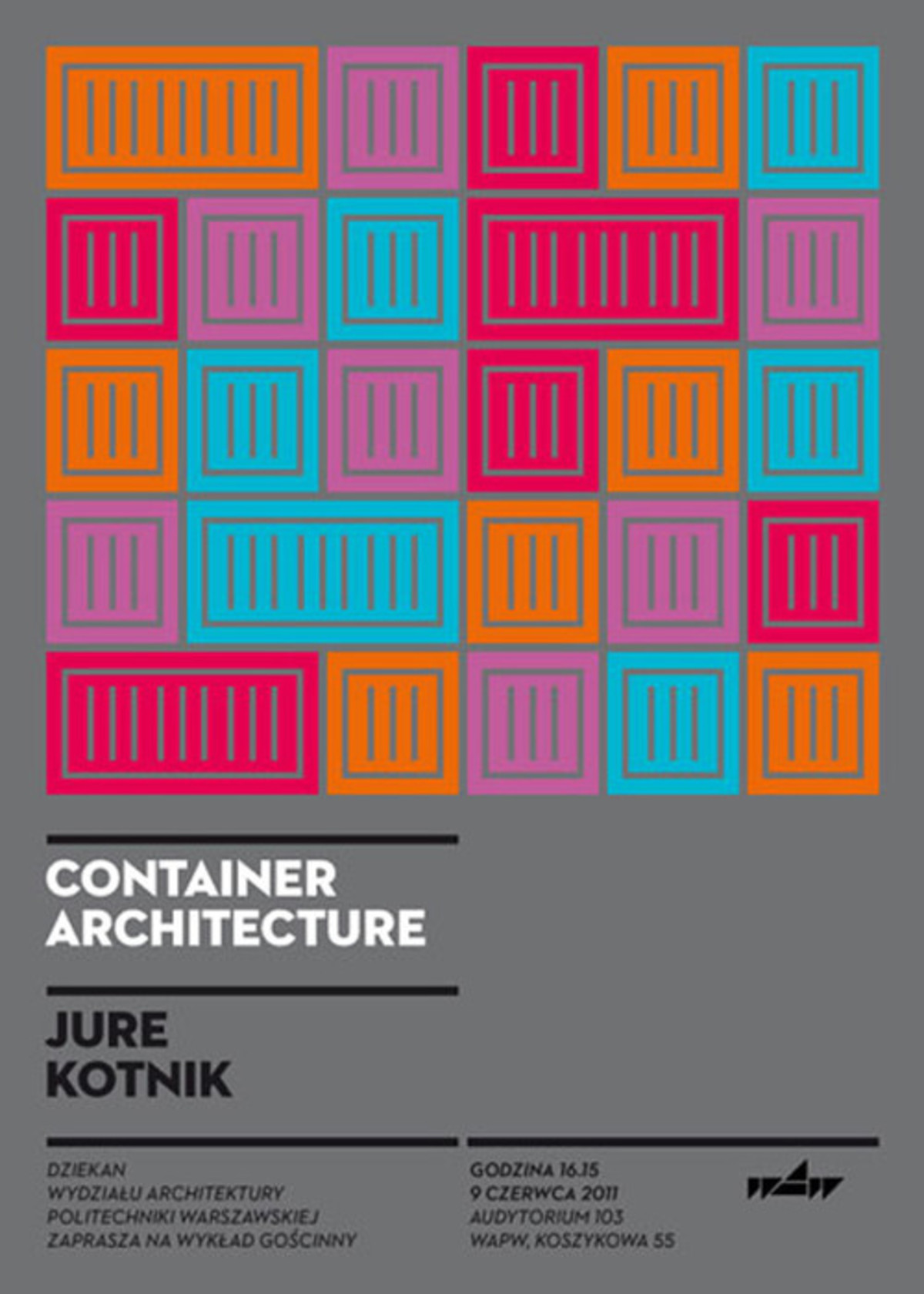 Wykład prezentuje architekturę z kontenerów z wielu perspektyw, pokazuje jeden ze sposobów odpowiedzi na wyzwanie naszych czasów ekonomicznego kryzysu i coraz większych wyzwań natury ekologicznej. Projekty, z których wiele to wybietne osiągnięcia architektury, pochodzą z wszystkich dziedzin architektury takich jak: konstrukcje tymczasowe i mobilne, budynki mieszkalne, budynki publiczne, aranżacje mieszkaniowe, przestrzenie publiczne oraz wszystko co istnieje pomiędzy. Udana przemiana kontenera - tego metalowego pudełka - z kokonu w motyla podkreśla fakt, że nie ważne co budujesz, tylko jak to robisz.Prócz pracy teoretycznej Jure Kotnik jest czynnym projektantem, autorem m.in. Domu Weekendowego 2+, Mobilnej Latarni Morskiej dla Ports du Paris i Tymczasowego Przedszkola w Ajda.