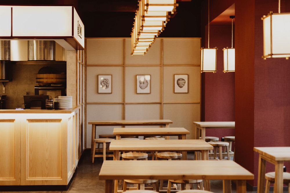 Dalej przestrzeń stopniowo się wycisza. Strefa inspirowana estetyką japandi wprowadza jasne drewno, naturalne tkaniny i miękkie światło, oferując chwilę wytchnienia. Kontrastem jest część Wschodu – nasycona burgundem i oranżem, z ciemnym drewnem i kolorowymi lampionami z indyjskich tkanin.