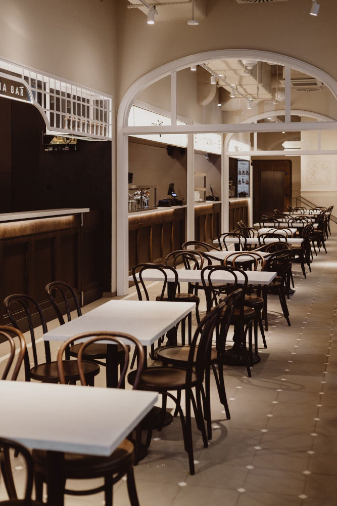 Wejście do Kulinarnej Kamienicy przywołuje pierwotny charakter obiektu. Wysokie sklepienia, rytm witryn, secesyjne detale i centralnie usytuowany bar o łukowej formie tworzą atmosferę eleganckiej, dworcowej galerii z początku XX wieku. – Nawiązanie do secesji, które wita gości od wejścia, to hołd dla tych dawnych wnętrz – podkreśla Dorota Terlecka.