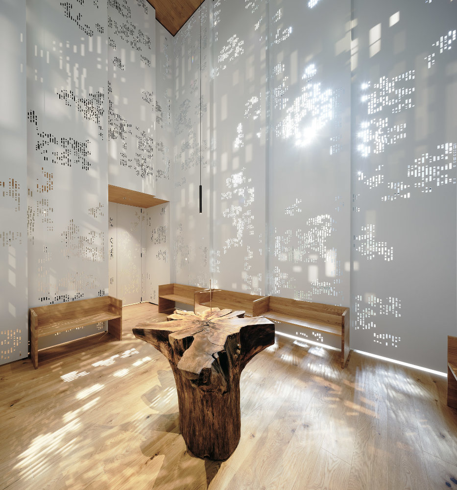 W centrum kaplicy znajduje się unikatowy ołtarz, wykonany przez uznanego austriackiego rzeźbiarza z odwróconego karpu drzewa orzecha włoskiego. Otoczony powierzchniami fraktalnymi oraz subtelnie modelowany światłem, ołtarz staje się silnym symbolem odnowy, zakorzenienia i transcendencji.
